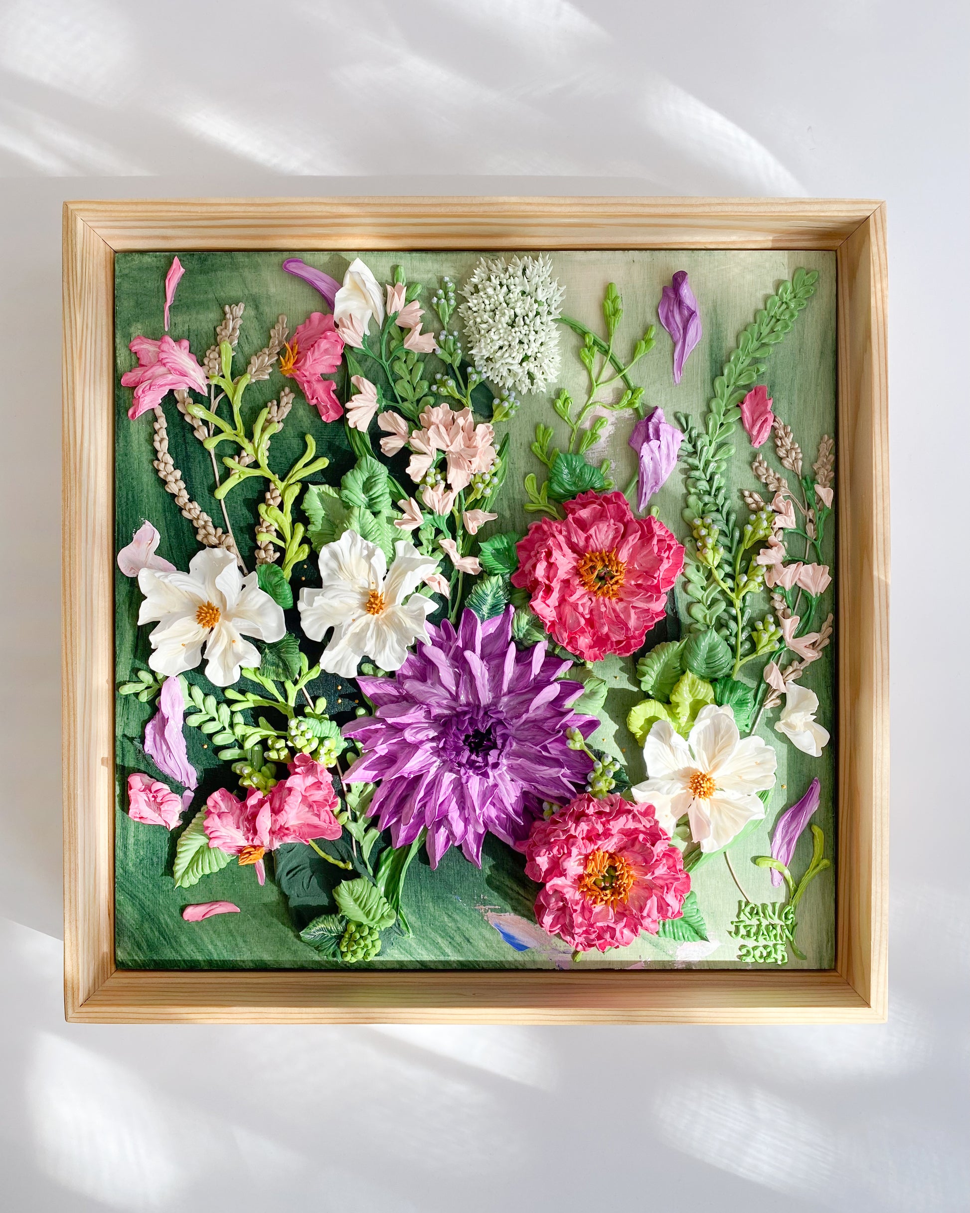 This piece carries the feeling of a peaceful pause, inviting you to slow down, breathe, and reconnect with yourself. Subtle shifts in color and raised floral details echo the beauty of nature’s stillness, transforming the space into a soft sanctuary of light.