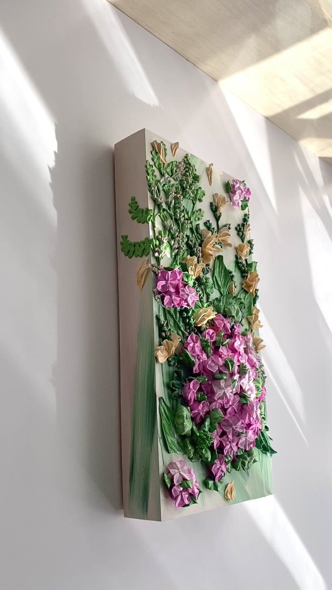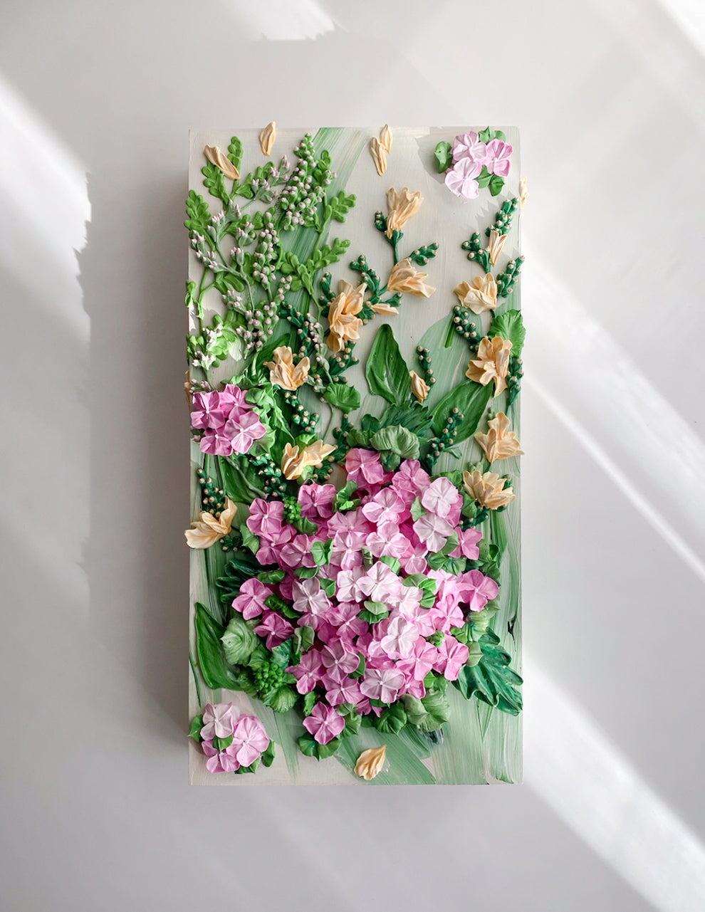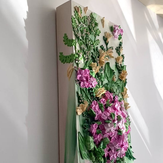 “Blush Reverie” is a gentle daydream in color — soft pinks and warm light weaving through textured layers like a memory half-awake. The raised floral forms and blended hues invite a quiet sense of wonder, a space where stillness and emotion softly intertwine.