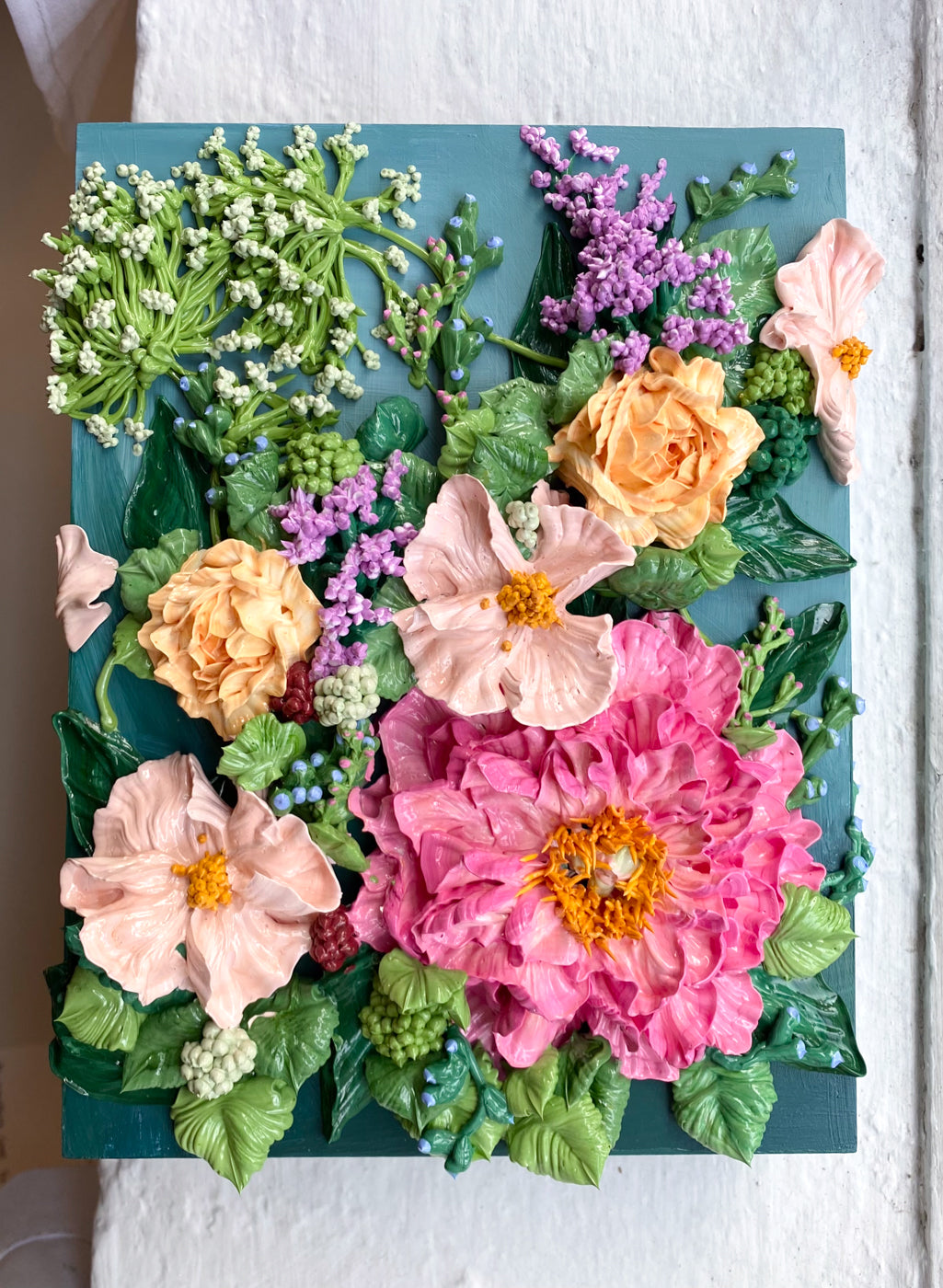 – Painted and piped on a wood panel